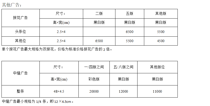 指定非廣告版加收10000元,指定版位加收5000元;三天內(nèi)加急加收廣告價(jià)格的20%。