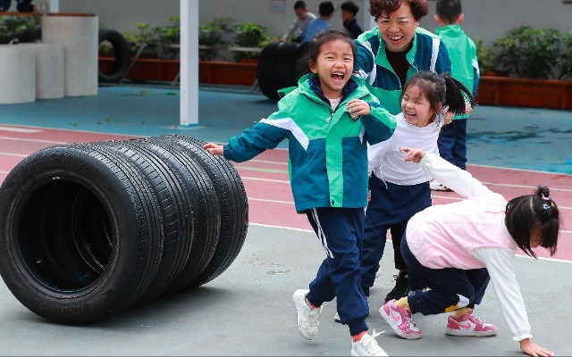 “小朋友們!大膽點兒,有老師在呢。”近日,貴州省仁懷市國酒城第一幼兒園老師丁冰鼓勵孩子們參與“好玩的輪胎”游戲,鍛煉孩子們膽量和團結合作精神。