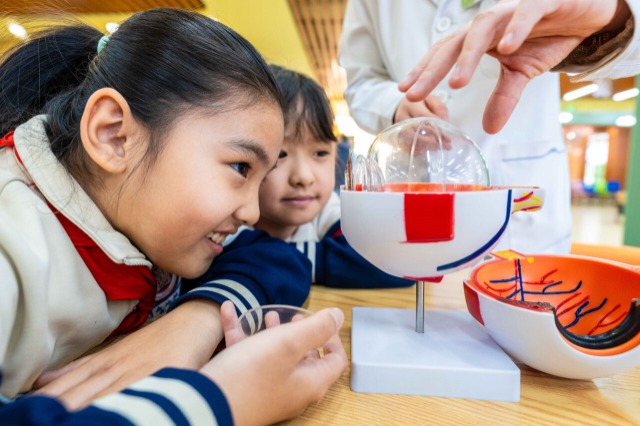 學生在醫護志愿者的指導下了解眼球構造。通訊員 丁根厚 攝