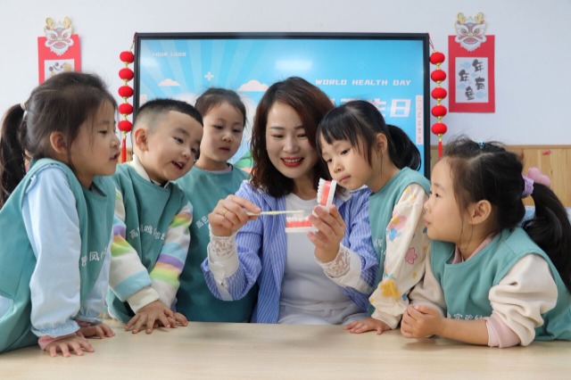 4月7日是世界衛(wèi)生日,山東省高密市鳳鳴實驗幼兒園開展主題教育活動,老師通過示范講解、衛(wèi)生兒歌、互動游戲等方式,引導小朋友養(yǎng)成良好的衛(wèi)生習慣。中國教育報-中國教育新聞網(wǎng)通訊員 李海濤 攝