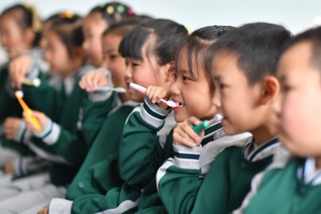 學生們在練習正確的刷牙方式。通訊員 王海濱 攝