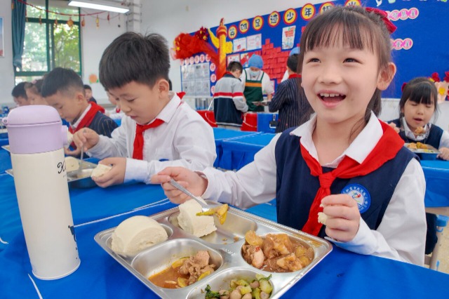 學生正在享用美味午餐。中國教育報-中國教育新聞網記者 單藝偉 攝