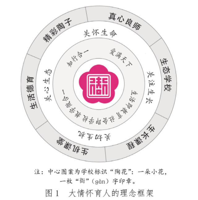 陶行知先生給后人留下豐厚的精神遺產,最動人、最有力量的就是“愛滿天下”的大情懷,“要想完成鄉村教育的使命,屬于什么計劃方法都是次要的,那超過一切的條件是同志們肯不肯把整個的心獻給鄉村人民和兒童。真教育是心心相印的活動。唯獨從心里發出來的,才能打到心的深處”。在40多年的探索中,我們鮮明地提出了大情懷育人的教育主張,構建了大情懷育人體系,形成了體現獨特兒童觀、教育觀、學校觀、課程教學觀的本土教育話語方式(見圖1)。