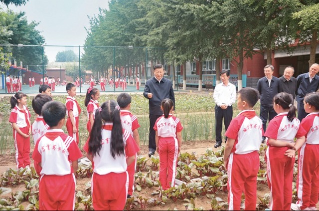 2023年5月31日上午,中共中央總書記、國家主席、中央軍委主席習近平來到北京育英學校看望慰問師生,向全國廣大少年兒童祝賀“六一”國際兒童節快樂。這是習近平在學生農場同正在進行農業種植實踐的小學生們親切交流。 新華社記者 鞠鵬/攝