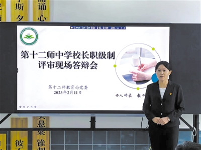 第十二師把全師所有校長(zhǎng)崗位拿出來競(jìng)聘。根據(jù)方案,第十二師教育系統(tǒng)內(nèi),凡工作滿3年的校長(zhǎng)、中層干部、教師均可申報(bào)校長(zhǎng)崗位競(jìng)聘,參與中小學(xué)校長(zhǎng)職級(jí)制改革。通過個(gè)人申報(bào)、專家評(píng)審、線下收集資料賦分、線上答辯評(píng)分等方式,校長(zhǎng)職級(jí)制評(píng)審委員會(huì)對(duì)申報(bào)校長(zhǎng)崗位的人員進(jìn)行綜合考評(píng)。