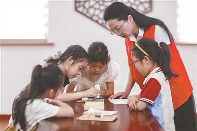 8月3日,在江蘇省興化市圖書館“活字印刷”體驗館,學生在黨員志愿者的指導下體驗活字印刷。當日,興化市圖書館開展“書香潤童年 攜手印美好”活字印刷體驗活動,讓學生領略活字印刷的獨特魅力,感受中國漢字之美。 周社根 攝