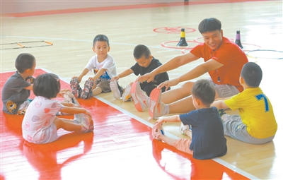 為培養幼兒對運動的興趣,河北省滄州市第一幼兒園東園區小班幼兒日前走進籃球俱樂部,開展“籃球悅童心 運動強體魄”暑期體驗活動,讓幼兒在歡樂、自由的氛圍中享受運動的樂趣。圖為教練在帶幼兒進行熱身活動。