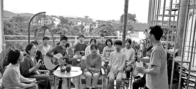 暑假,張春燕(左二)和學(xué)生們一起在洱海邊讀書、唱歌。(作者供圖)