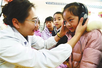 在全國愛耳日到來之際,江蘇省鎮江市蔣喬社區衛生服務中心醫務人員在童蕾藍天幼兒園指導小朋友正確使用耳機。當日,該服務中心醫務人員來到童蕾藍天幼兒園,開展“愛耳護耳 從小做起”活動,引導小朋友從小養成愛耳護耳習慣。石玉成 攝