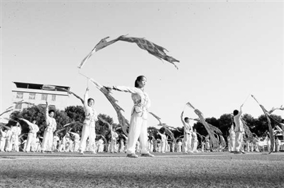 在湖南省永州市新田縣龍泉四小運動場,學生們在嫻熟地舞動民間傳統運動項目彩帶龍。劉貴雄 鄭軍 攝