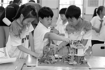 大圖:在李漁小學的“創生周”,學生學習制作李漁故居的標志性建筑“且停亭”。