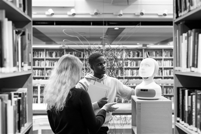 學(xué)生在圖書館使用語音助手。