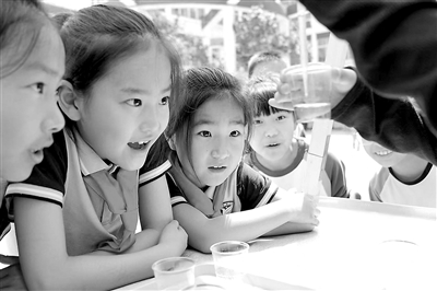 山東省威海高區第一小學學生在學校“實驗秀場”活動中觀察實驗操作過程。學校供圖