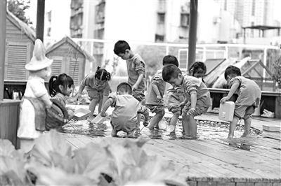 深圳市第六幼兒園農(nóng)耕園的雨水池里,孩子們與水中的小魚歡樂互動。蔡信能 攝