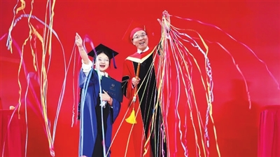 中國農(nóng)業(yè)大學(xué)畢業(yè)典禮上,校長孫其信與畢業(yè)生互動合影。學(xué)校供圖