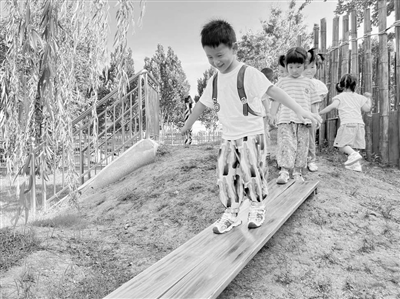 教研進入第四周,隨著教師和家長放心、放手,小班幼兒的膽量和運動能力飛速提升,戶外活動場發生了奇妙變化。最明顯的是小山坡,以前幾乎看不到小班幼兒的身影,現在那里卻成了小班“冒險家們”的樂園。明明攀登陡坡走不穩,多次嘗試失敗后竟手腳并用爬上了坡頂。他開心地大喊:“老師,你看看我!”最靦腆的朵朵,也敢在壕溝之間的獨木橋上張開雙臂保持平衡走來走去。