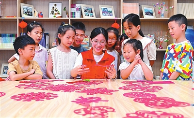 圖② 近日,在四川省眉山市仁壽縣新時代文明實踐中心,志愿者正在教孩子們剪紙。潘建勇 攝
