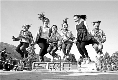 廣西柳州市融水苗族自治縣特崗教師與學生一起跳繩。 本報記者 張勁松 攝 (資料圖片)