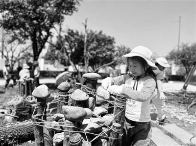 腳手架2.0(優化認知環境)。幼兒果然開始利用木樁作為更高的平臺,但隨之而來的是新的問題:木樁之間有縫隙,石頭會掉下去。幼兒開始抱怨:“要把這個縫隙塞住才行!”聽到這個聲音,我們立刻進行第二次現場研討。我們意識到,此時的“腳手架”不應是直接給出答案,而是提供解決問題的“半成品”——我們將散落的樹枝、樹皮等歸攏到材料庫,方便幼兒尋找和嘗試。