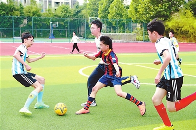 浙江省金華師范學校附屬小學的學生在操場上踢足球。       學校供圖