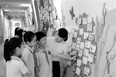 浙江省杭州市濮家小學師生在“問題墻”前交流。