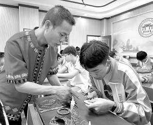 海南中學(xué)白沙學(xué)校學(xué)生在非遺傳承人指導(dǎo)下制作黎錦冰箱貼。王柳蕓 攝